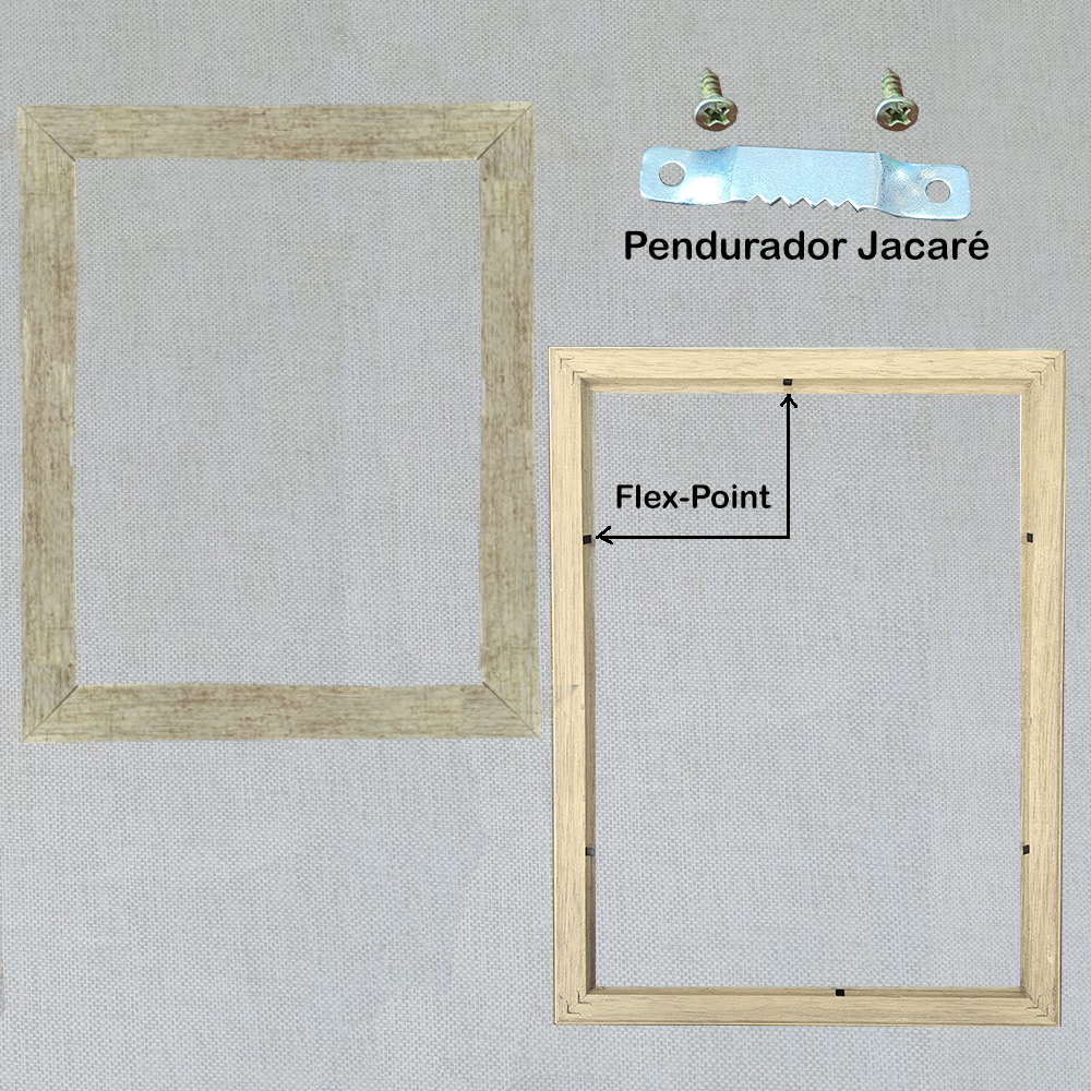 "Independente do Tamanho ou Cor que você escolher". A moldura é enviada pronta como na foto abaixo. Ela vai com o Flex-Point instalado e o Pendurador Jacaré separado para você colocar.